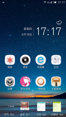 朵唯倾城L3的锁屏界面采用滑动方式解锁,相机快捷按键设计锁屏界面的右下角,用户只需向上拖动图标即可开启相机进行自拍。进入主界面后,可以看到朵唯倾城L3延续上代产品无二级菜单的设计,一切操作都在桌面进行,如果有太多程序没地方放,可通过合并应用增加空间。